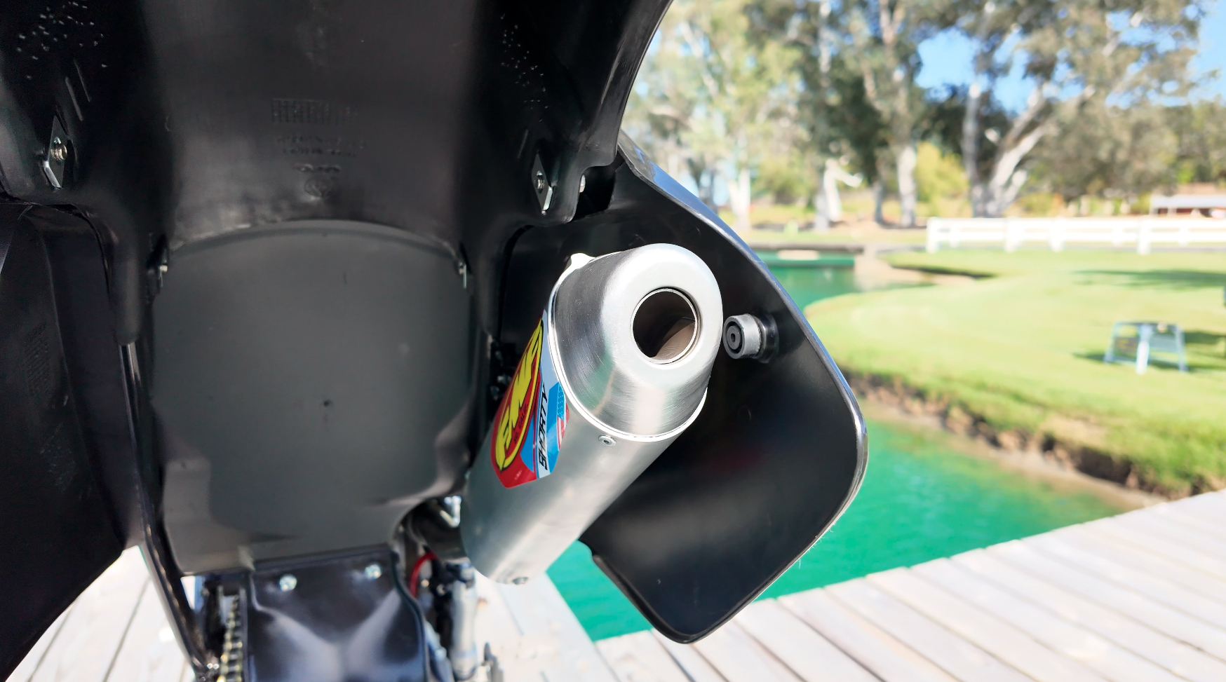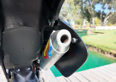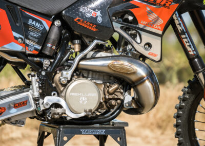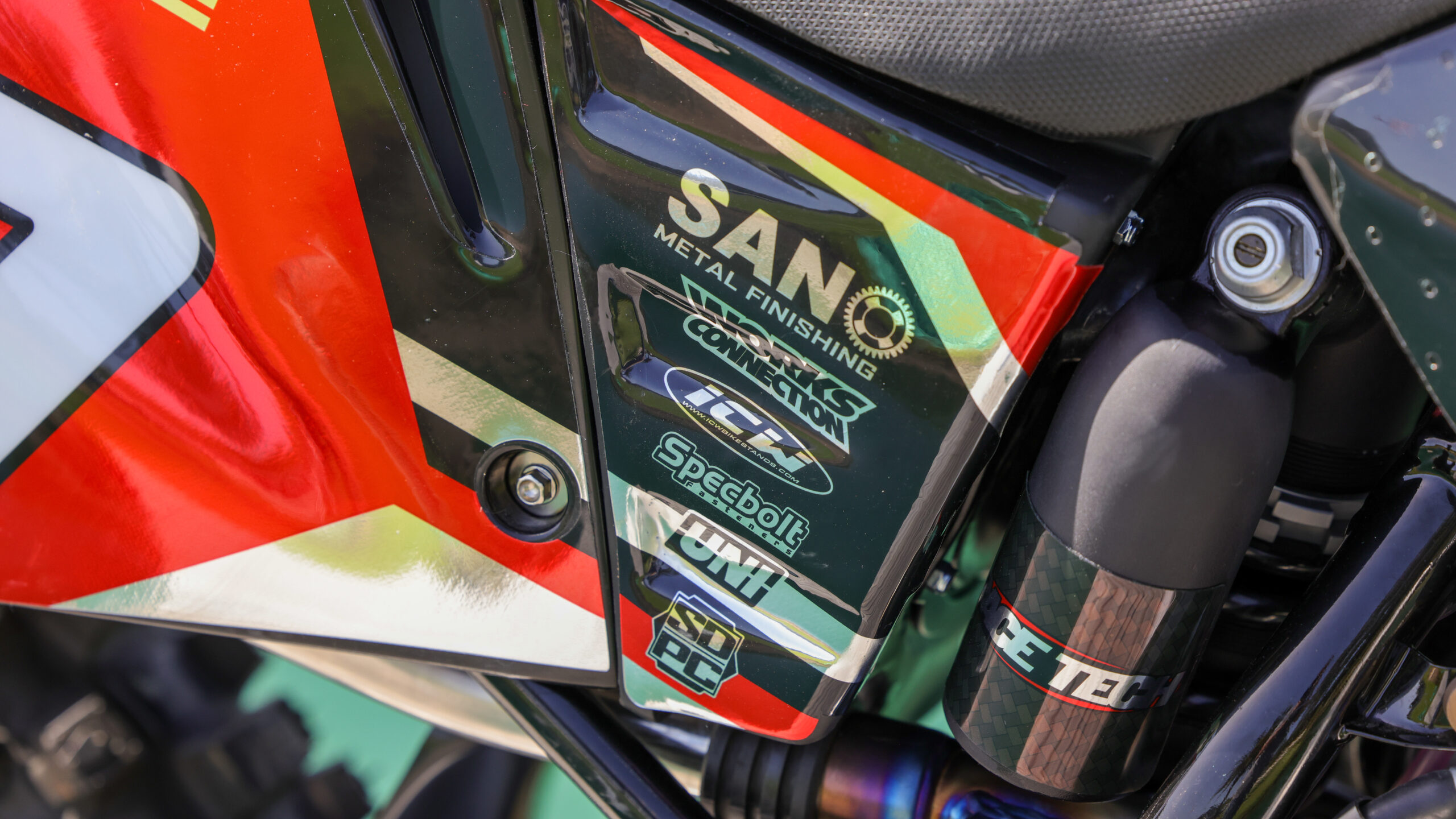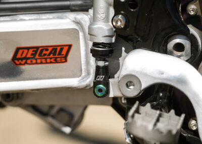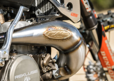 Undoubtedly, one of the most distinctive parts of this bike is the custom “Factory” Gnarly pipe from FMF. The most frequent query about this pipe is, “Where can I find that rad factory finish pipe?” Regrettably, it’s not available for purchase. To achieve that exceptional finish, we had to acid dip the pipe to remove the chrome, after which Robbie from Robbie’s Pipe Repair polished the pipe, added some weld lines, and affixed a custom FMF badge to complete this masterpiece.